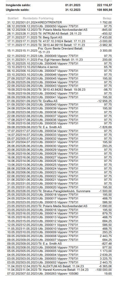 Ei kontoutskrift vert lagt ved til rekneskapet.